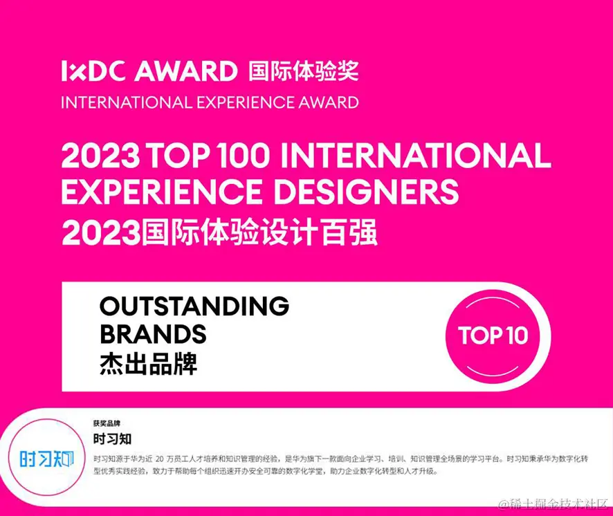 12月22日,由国际体验设计大会组委会发起主办的“IXDC AWARD国际体验奖”公布了“2023国际体验设计百强”获奖名单,时习知凭借综合实力斩获2023国际体验设计百强·十大杰出品牌称号。同时,时习知首席用户体验官刘文华老师荣获“十大杰出男性设计师”奖项。
