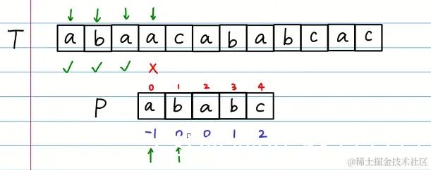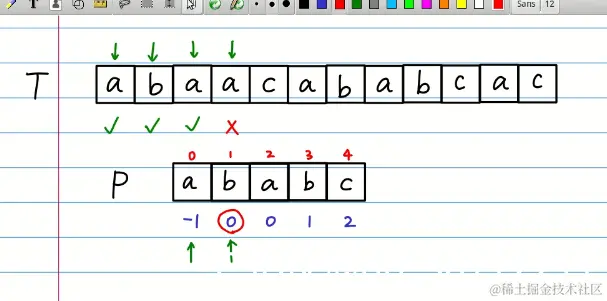 若比较到不一样的情况,则将p字符串移动到此时他prefix表下标的值的位置(例如此时T的a与P的b不一致,而b的prefix表的值为0,所以则将p字符串的下标0移动到prefix 0 的位置,也就是p字符串整体后移一位)如图: