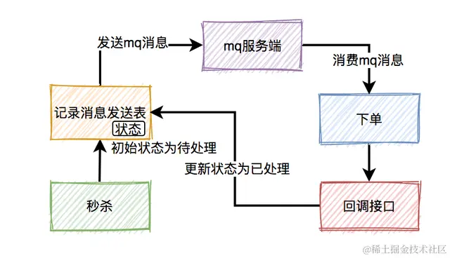 在生产者发送mq消息之前,先把该条消息写入消息发送表,初始状态是待处理,然后再发送mq消息。消费者消费消息时,处理完业务逻辑之后,再回调生产者的一个接口,修改消息状态为已处理。
