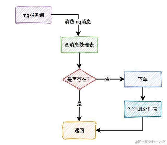 消费者读到消息之后,先判断一下消息处理表,是否存在该消息,如果存在,表示是重复消费,则直接返回。如果不存在,则进行下单操作,接着将该消息写入消息处理表中,再返回。