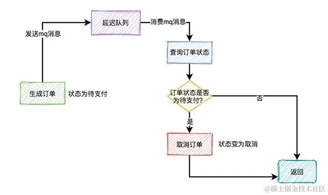下单时消息生产者会先生成订单,此时状态为待支付,然后会向延迟队列中发一条消息。达到了延迟时间,消息消费者读取消息之后,会查询该订单的状态是否为待支付。如果是待支付状态,则会更新订单状态为取消状态。如果不是待支付状态,说明该订单已经支付过了,则直接返回。