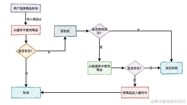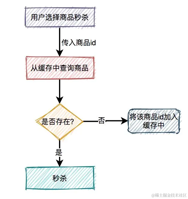 根据商品id,先从缓存中查询商品,如果商品存在,则参与秒杀。如果不存在,则需要从数据库中查询商品,如果存在,则将商品信息放入缓存,然后参与秒杀。如果商品不存在,则直接提示失败。