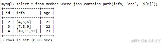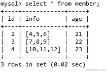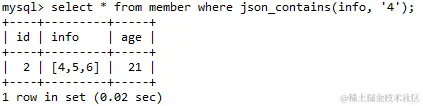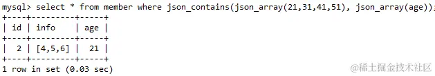 例三 select * from member where json_contains(json_array(21,31,41,51), json_array(age));
