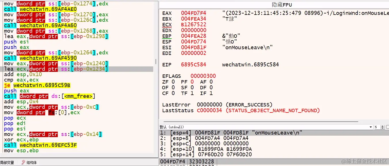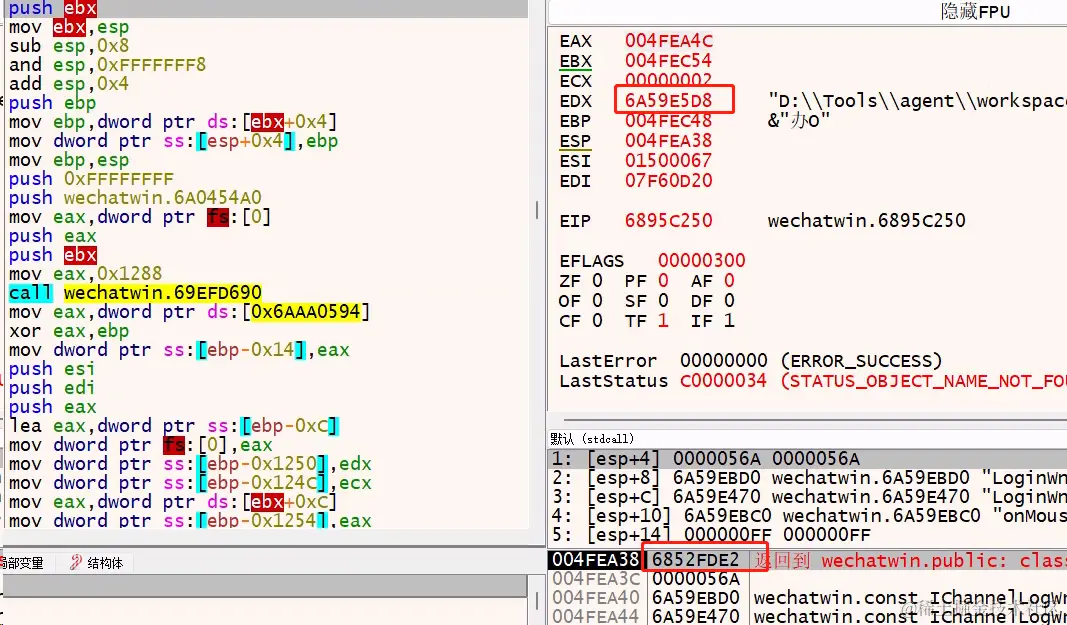 用x32dbg在日志函数头位置下个断点,看起来有两个有用的信息:EDX的代码路径和esp的函数返回地址。