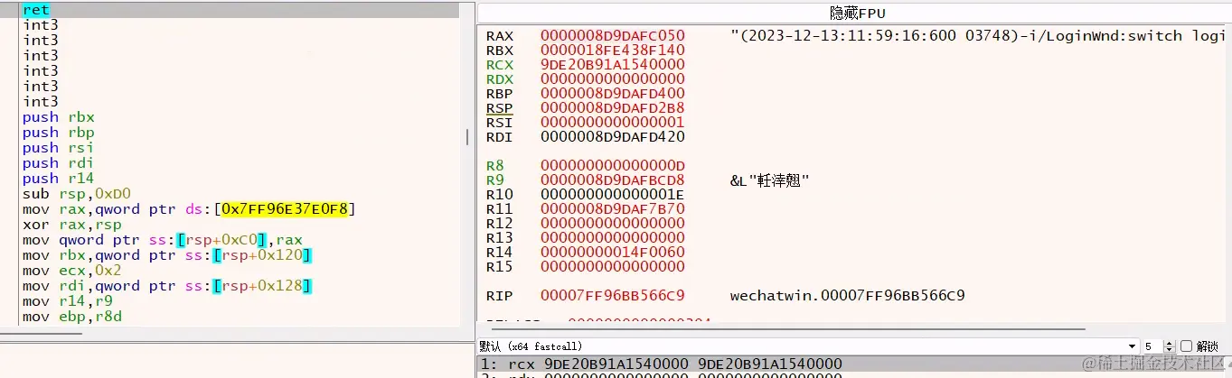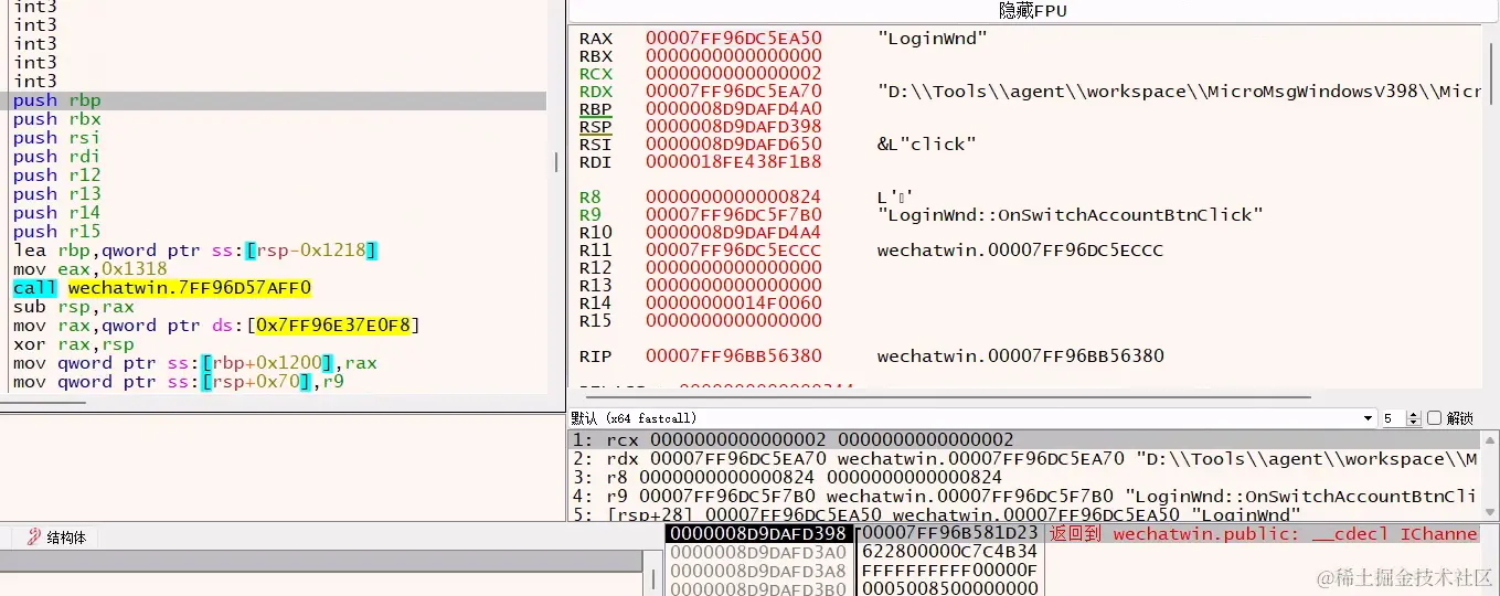 x64dbg打上断点,可以看到RDX是代码路径,而RDX是函数的第二个参数。因为获取不到寄存器,所以返回地址就拿不到了。