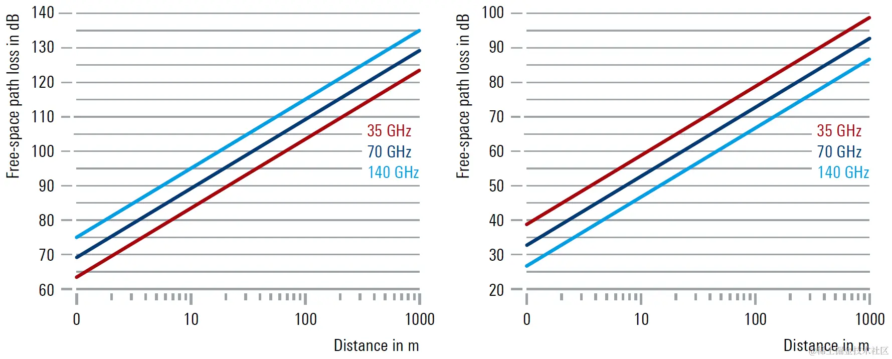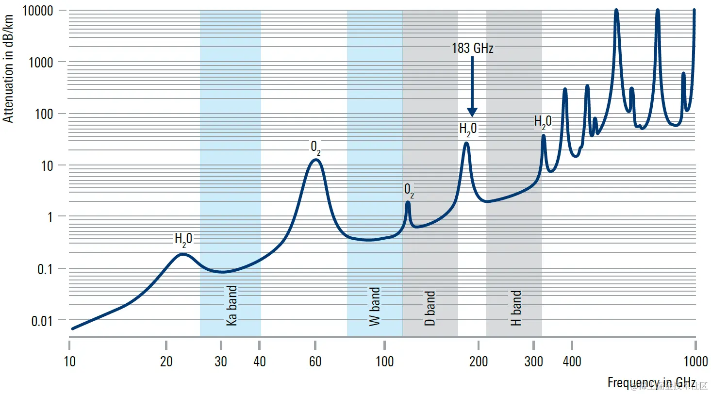 对于 5G 的演进(图2 中的 “Beyond 5G”),正在考虑 71GHz ~ 100GHz 的更高频率:浅蓝色频率范围是国际电信联盟(ITU)2019年世界无线电大会考虑的未来无线通信的频率范围(例如 81GHz ~ 86GHz)。虽然最初考虑了 80GHz 频段,但没有批准用于 IMT-Advanced(5G)。该频率范围还包含 60GHz 未授权频段(E频段从 60GHz 延伸到 90GHz)。