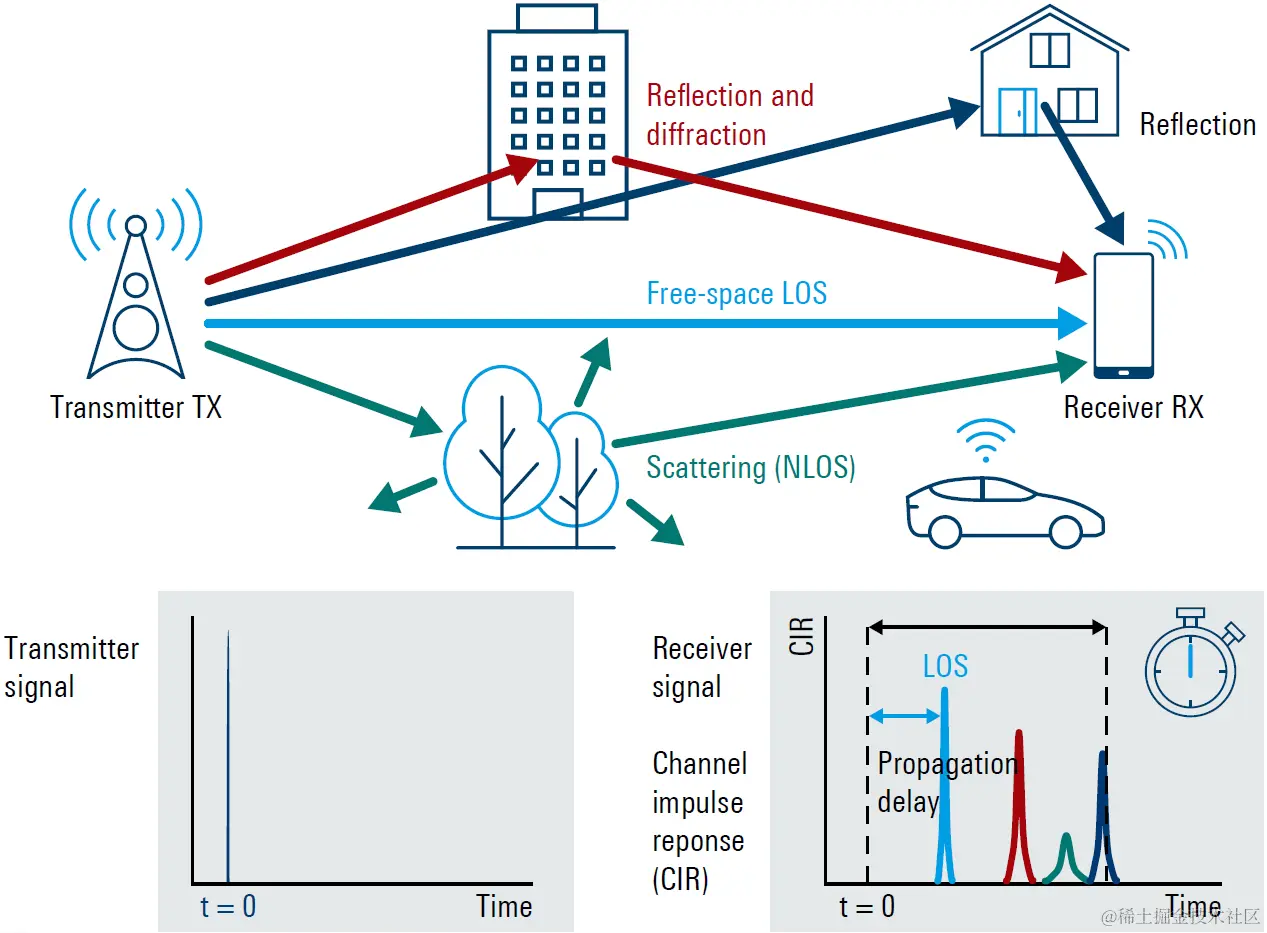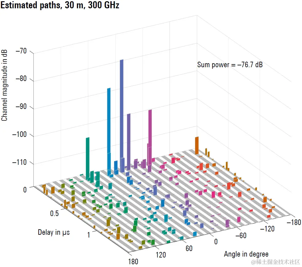 虽然大部分功率来自视距(LOS)方向,但重要的多径测量覆盖了所有的方位角方向。