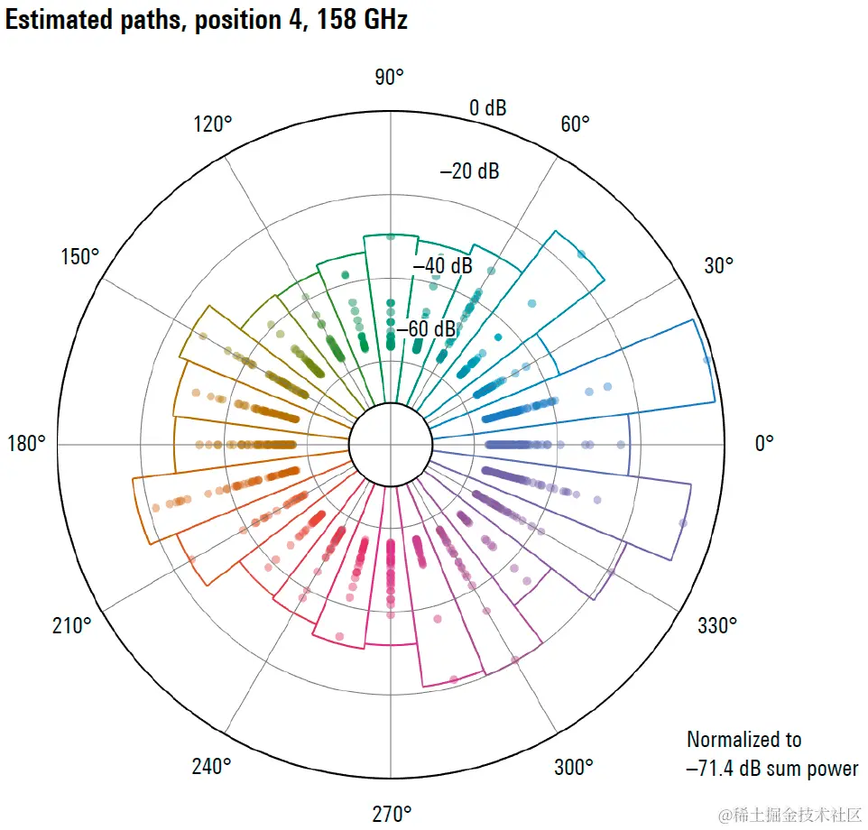 在底部的玫瑰图中,相同的数据集显示在极坐标图中,其中每个圆点对应一个峰值,三角形(“饼”)代表各自角度仓中的整体功率。可以观察到多个多径分量。