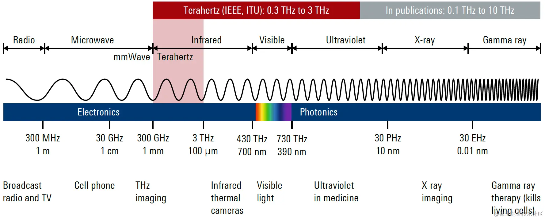 太赫兹波是介于微波和光波之间的光谱区域,频率从 0.1THz ~ 10THz 之间,波长在 3mm ~ 30μm 之间。提供大块连续的频带范围以满足对 Tbit/s 内极高数据传输速率的需求,使该区域成为下一代无线通信(6G)的重点研究领域。预计在 2030年 左右实现商业部署,太赫兹区域在 成像、光谱学 和 传感 等许多应用领域显示出巨大的前景。