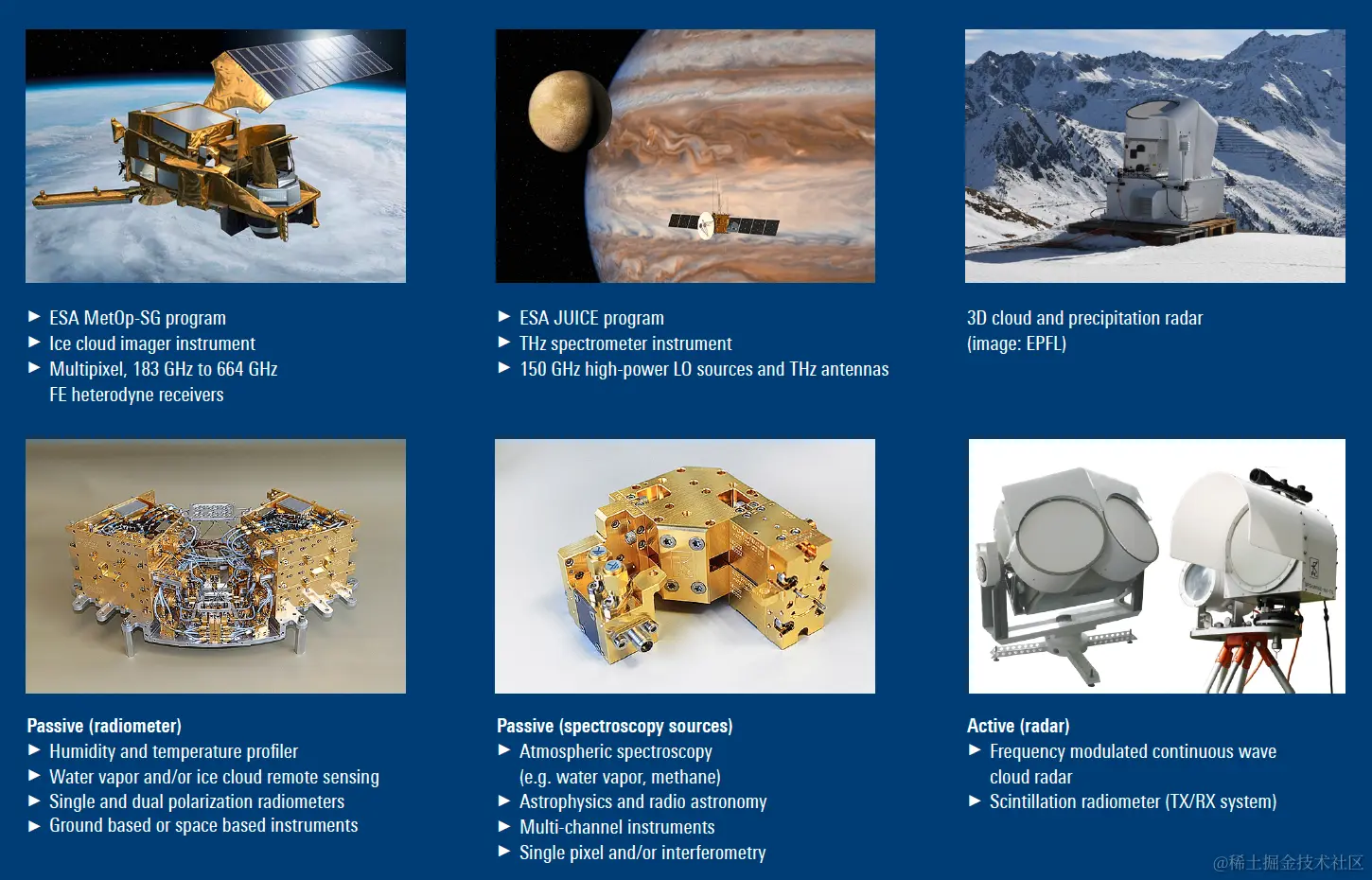 图4:太赫兹波在大气遥感和天体物理学领域的应用示例 左图:空间被动辐射仪冰云成像仪(ICI)多通道接收器(RX),工作在 183GHz ~ 664GHz 范围内(交付的飞行模型)(图片由 RPG / 空中客车 / ESA / EUMETSAT 提供)。中图:ESA JUICE 任务用于行星科学的亚毫米波仪器(SWI)光谱仪开发的 132GHz ~ 158GHz LO源(TX)示例。右图:用于云传感的 94GHz FMCW 雷达仪器和用于现场蒸发传感的 166GHz 闪烁辐射计仪器。