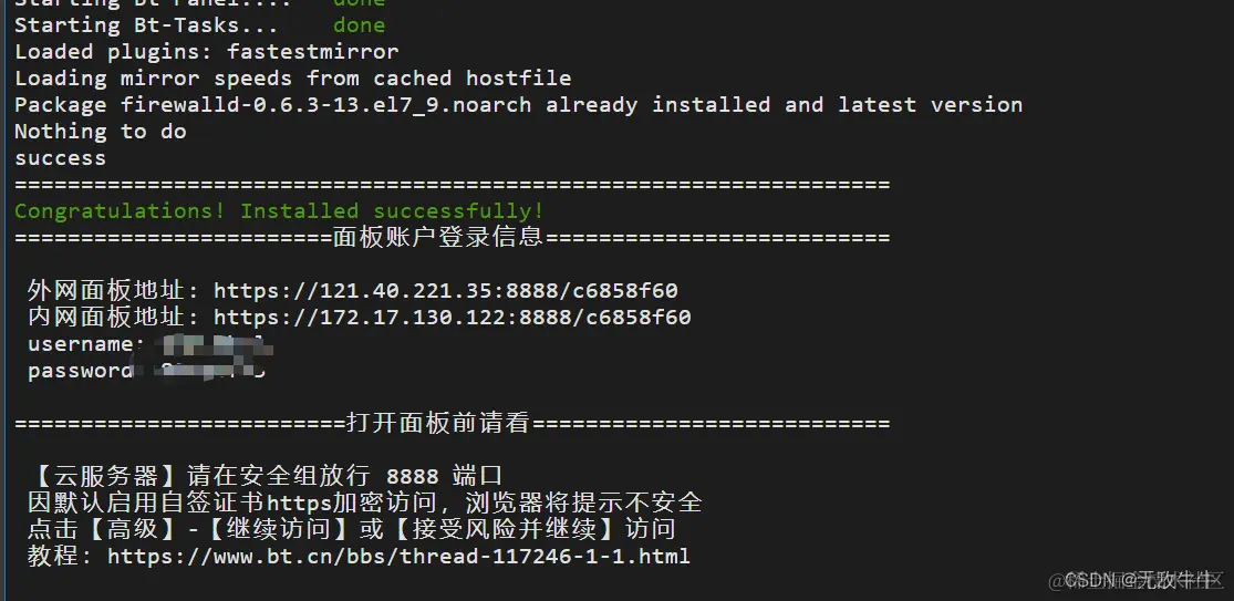 宝塔面板自动安装完成后,会显示宝塔后台登录地址、username和password,如下图: