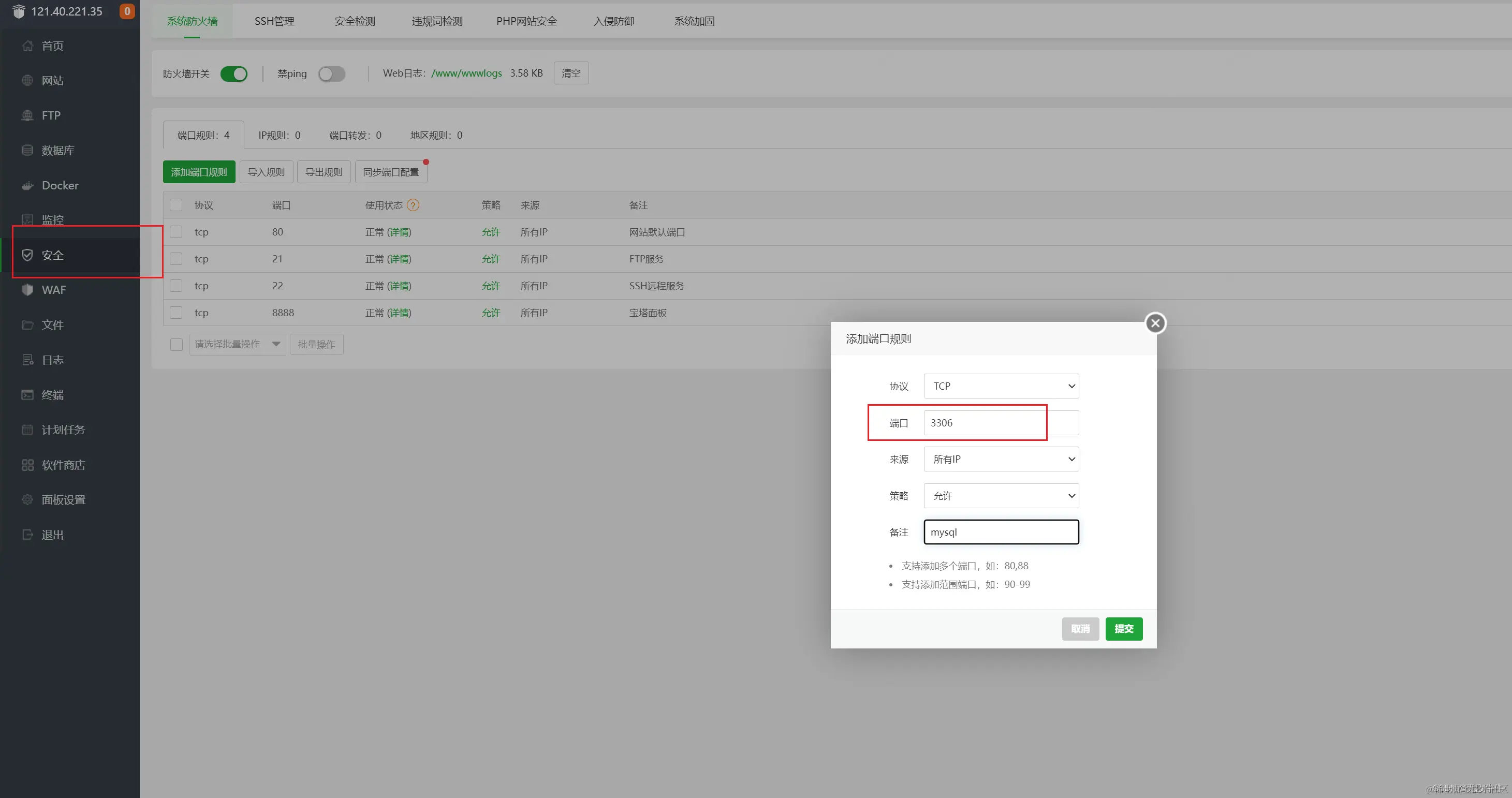然后我们在宝塔面板安全页面开放一个3306的端口