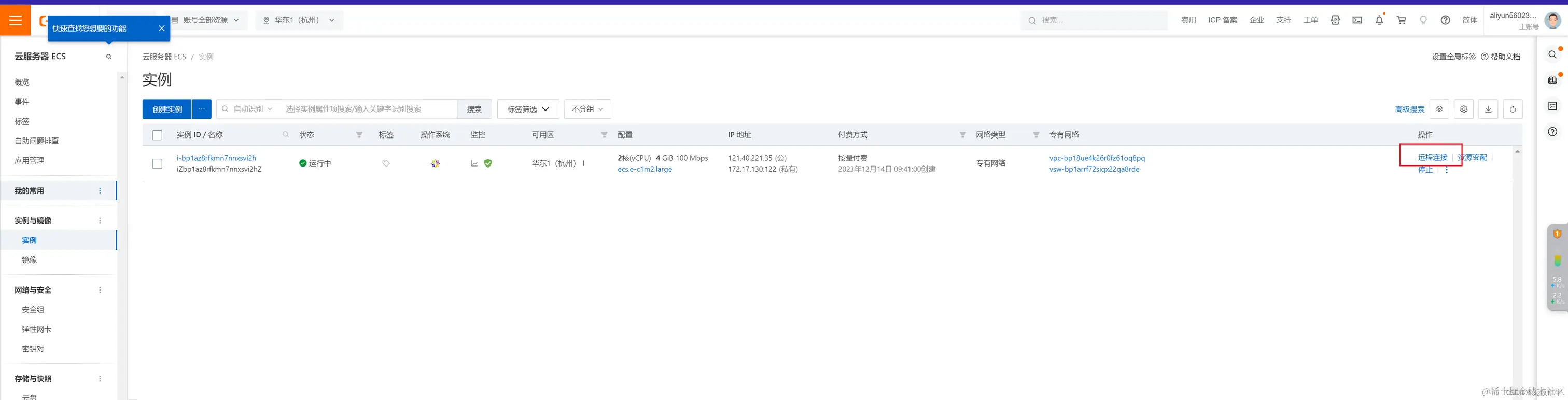 首先登录到云服务器ECS管理控制台,左侧栏【实例与镜像】>>【实例】,找到目标云服务器ECS实例,然后点击右侧的【远程连接】,如下图: