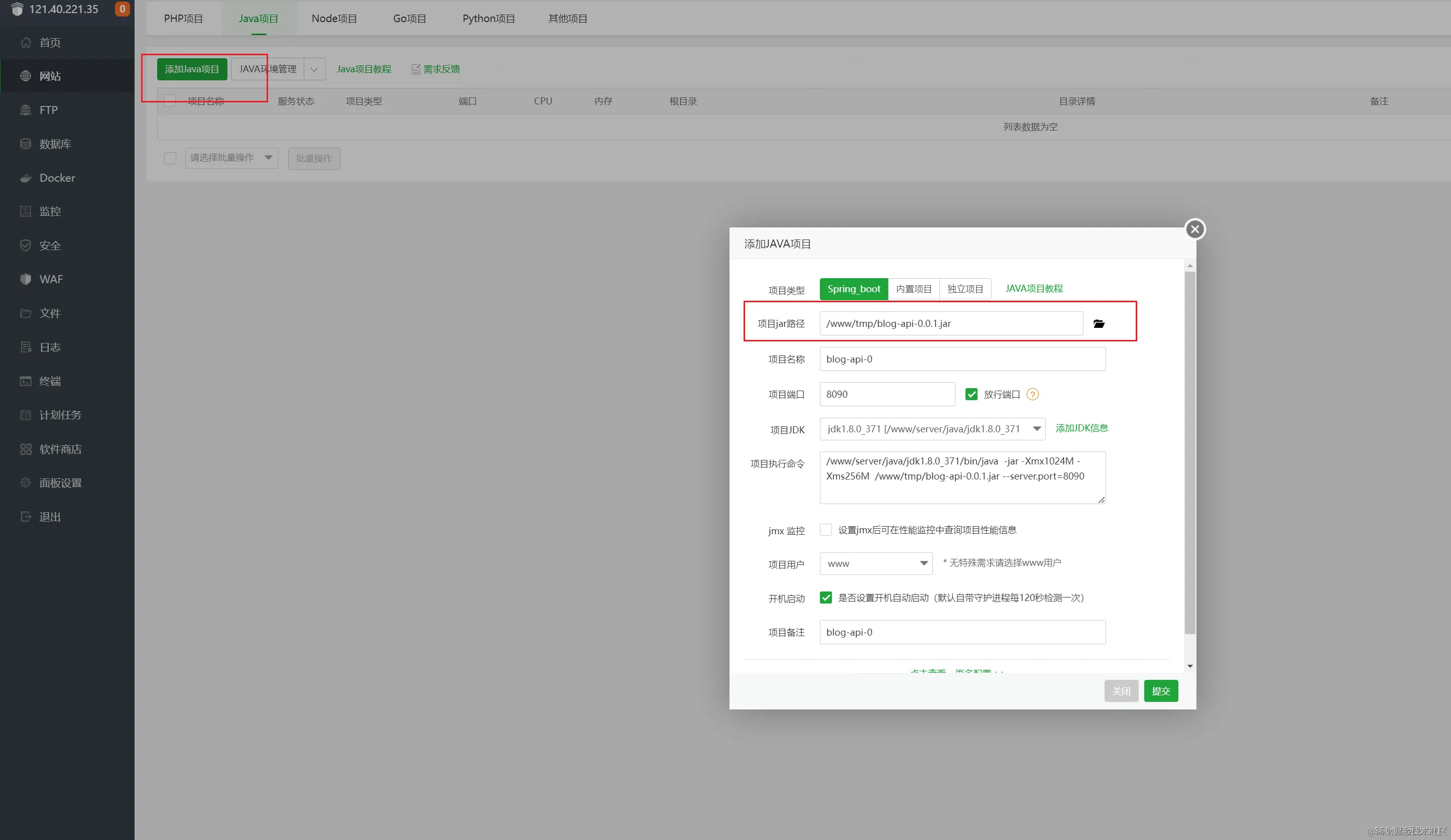 将jar包上传到宝塔
