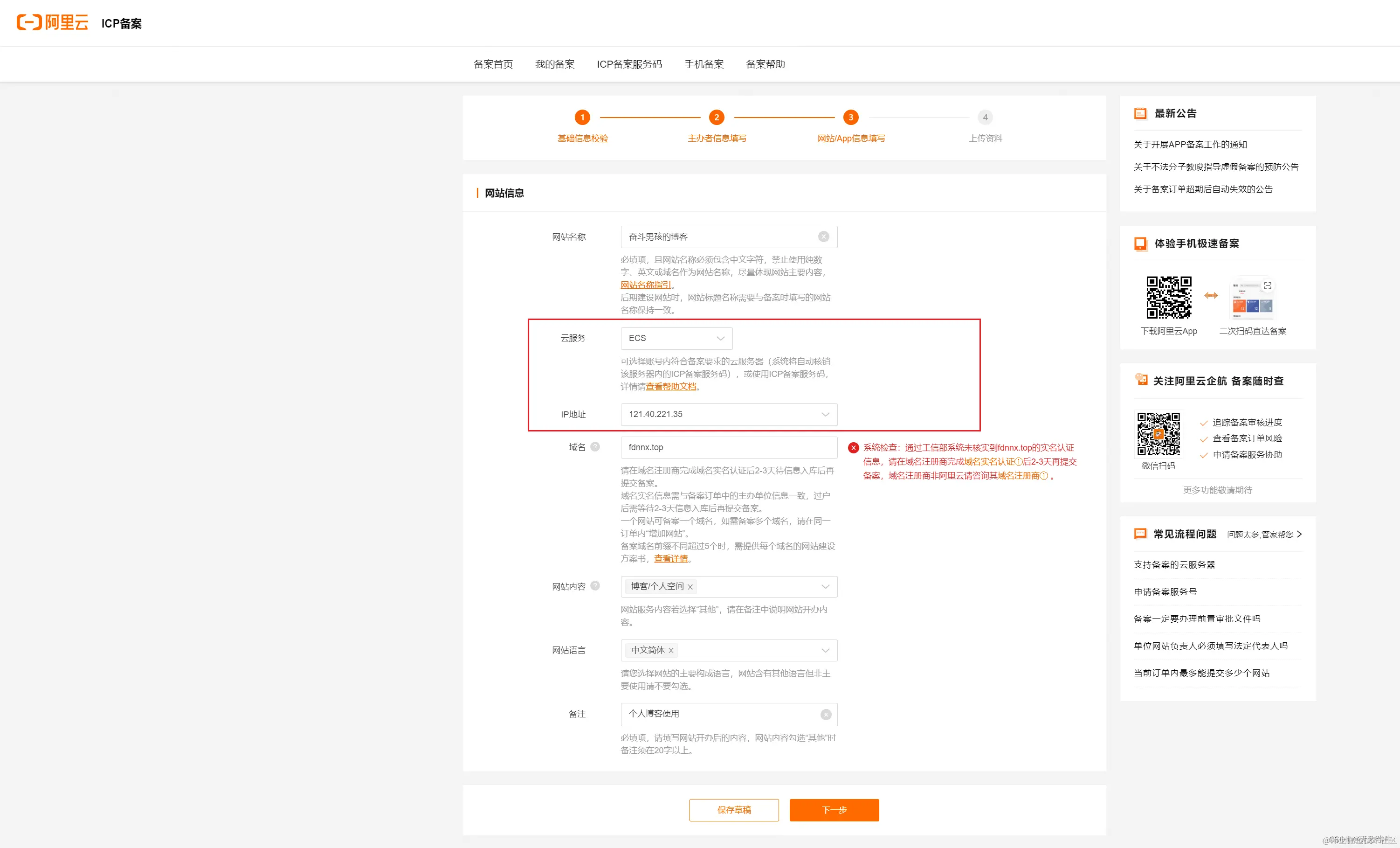 云服务选择ECS服务器,可以自动绑定IP进行备案