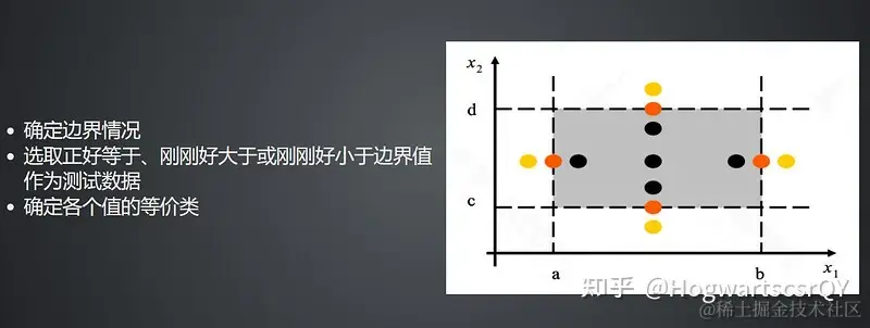 - 选取正好等于、刚好大于或刚好小于边界值作为测试数据