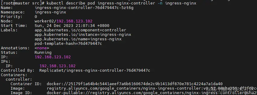 kubectl describe pod ingress-nginx-controller -n ingress-nginx可获取到ingress-nginx所在节点信息,IP为 192.168.123.102