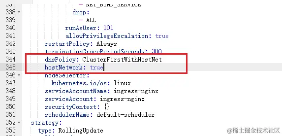 dnsPolicy: ClusterFirstWithHostNet策略将首先尝试使用主机的 DNS 解析服务来解析域名,如果主机的 DNS 无法解析该域名,将会尝试使用其他配置的 DNS 解析器