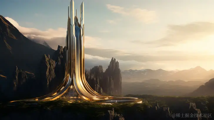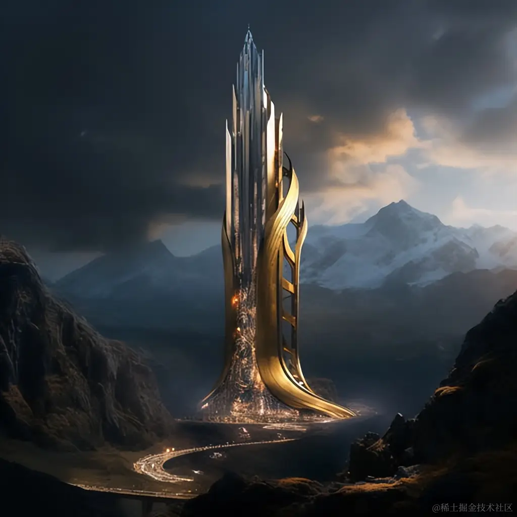 一座未来塔楼,风格为哑光画,深金和银色,巧妙的照明,大胆而优雅,山脉美景,丛林核心,超高清图像