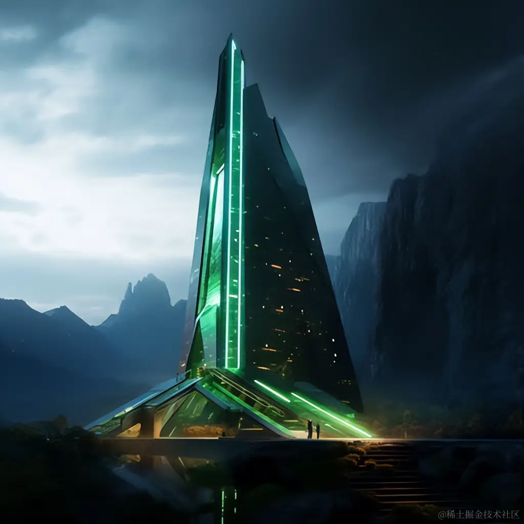 山上一座小建筑,风格为未来科幻美学,巧妙的照明,32K超高清,浅银和深翠绿,宏伟的纪念性,庞大的规模,奇幻的街道