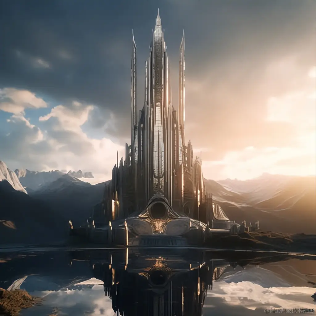 一座高塔矗立在湖前的高地上,风格为Zack Snyder,深银和浅金色,Mike Campau,令人难以置信的美丽,锯齿状边缘,装饰艺术灵感,地球朋克
