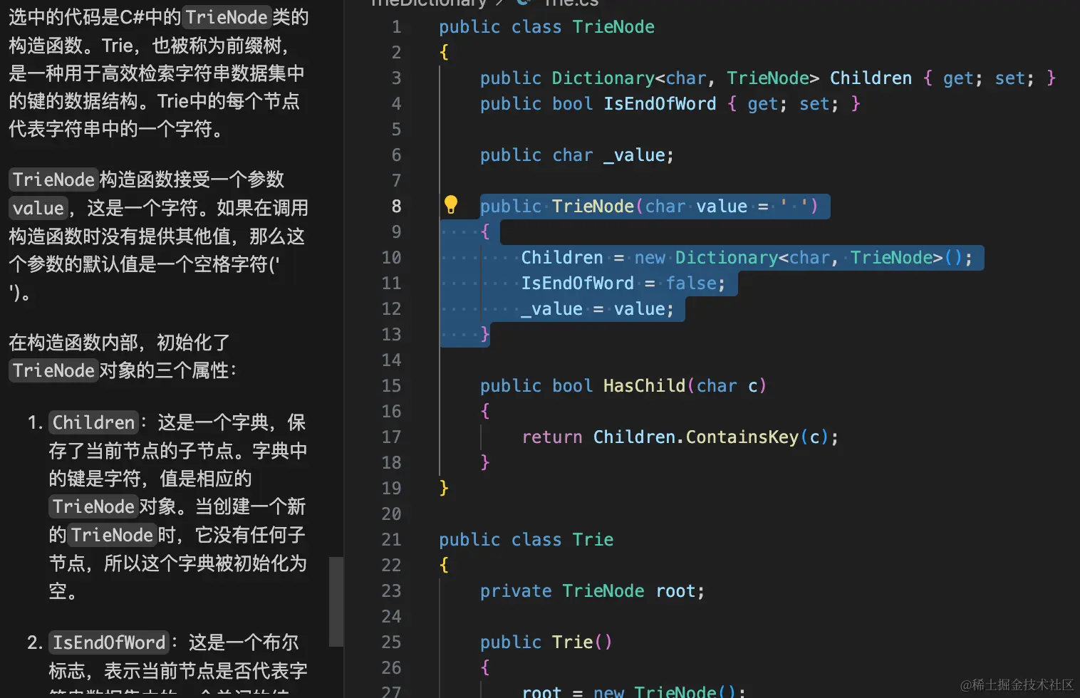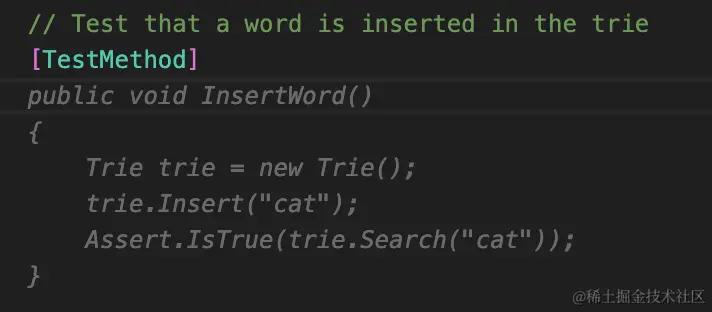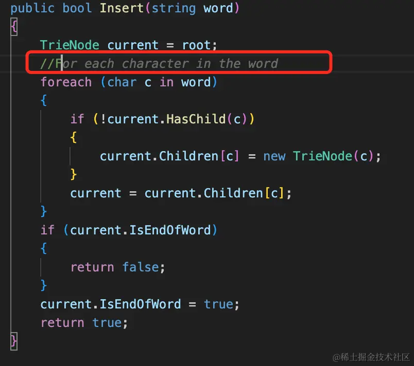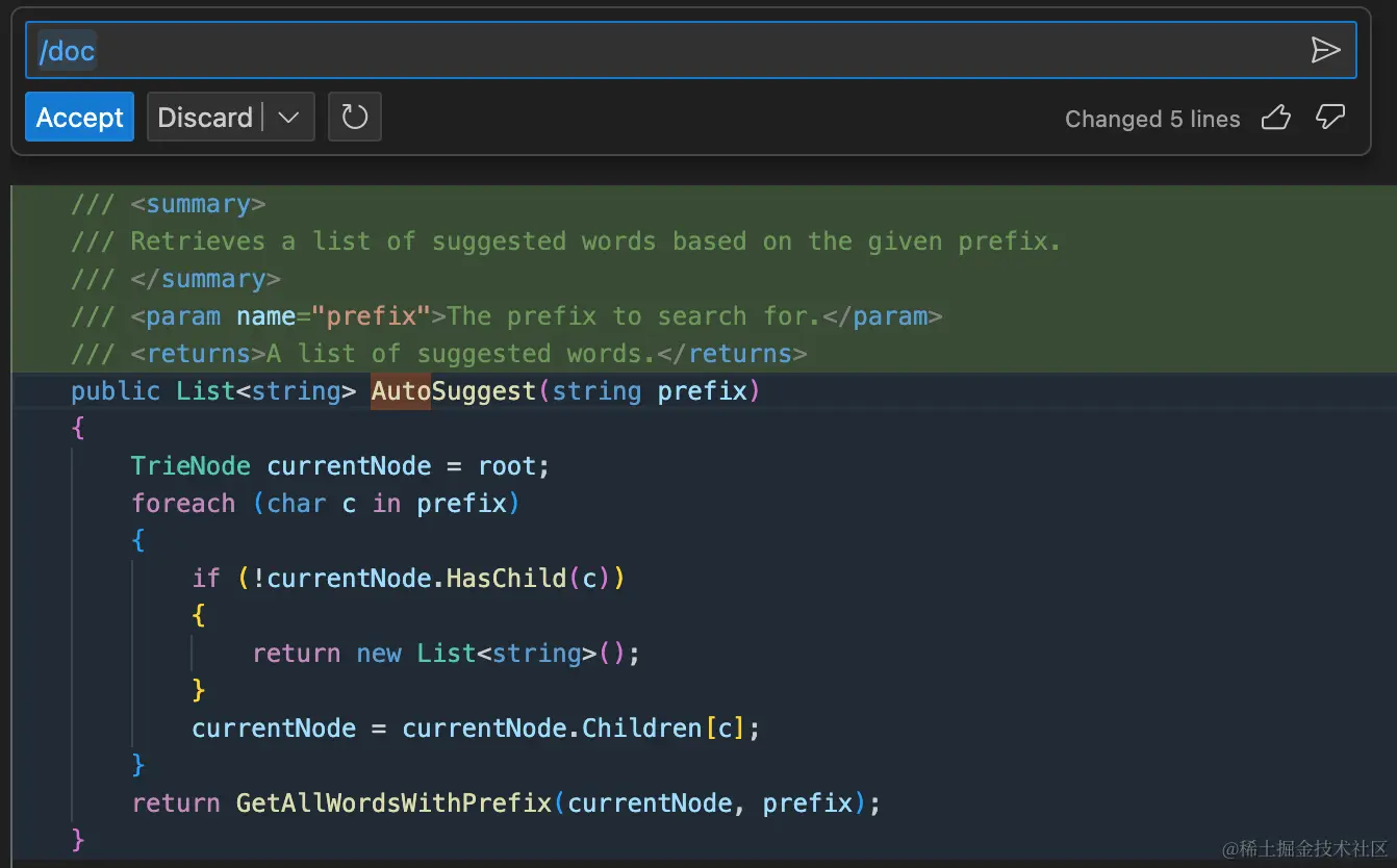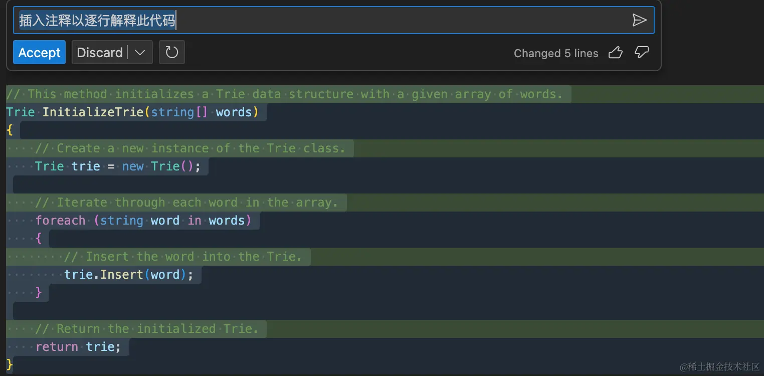 输入注释:// Search for a word in the trie,按 enter,就能看到推荐的完整代码了。