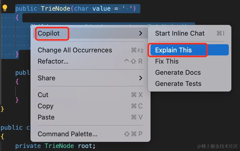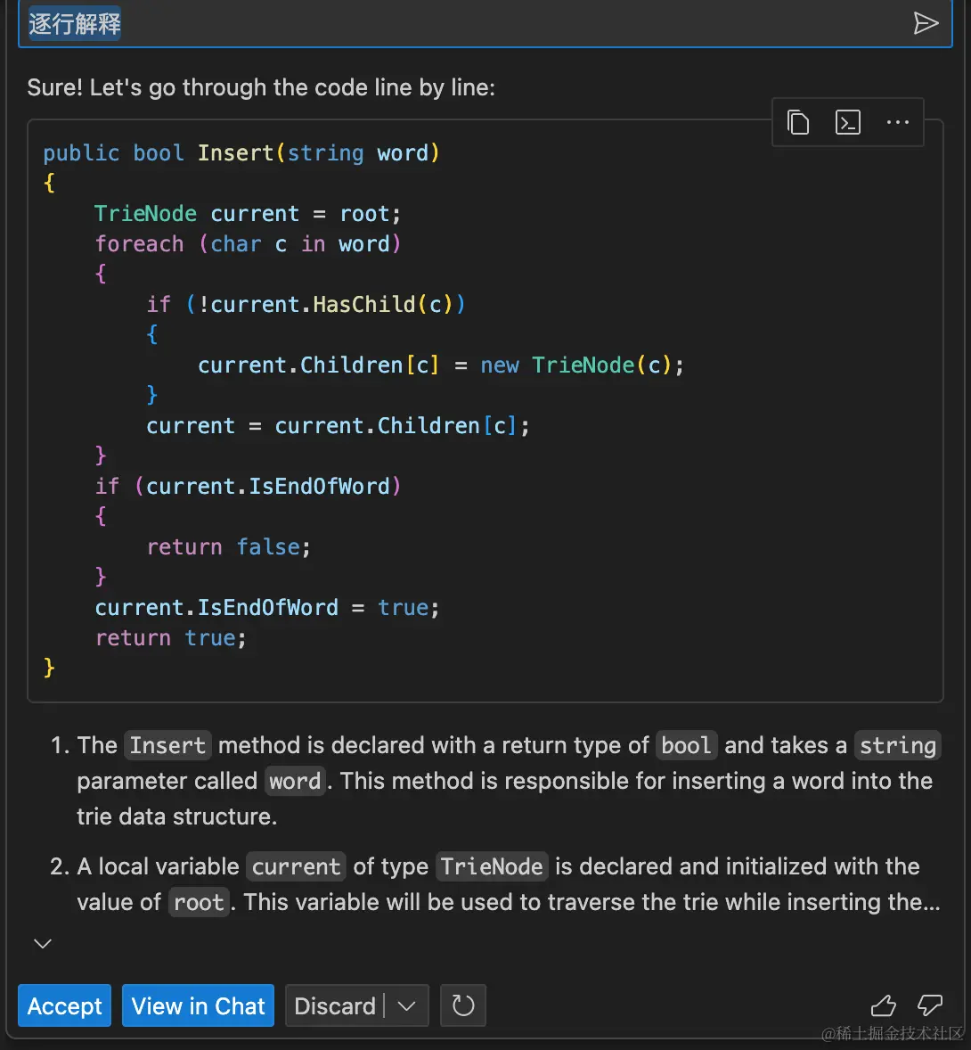 先右键,选择 Copilot,然后选择 Start Inline Chat,输入逐行解释。