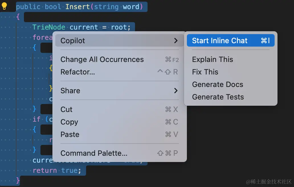 右键选择 Copilot,然后选择 Start Inline Chat,输入【插入注释以逐行解释此代码】,就可以为整个方法生成逐行注释。