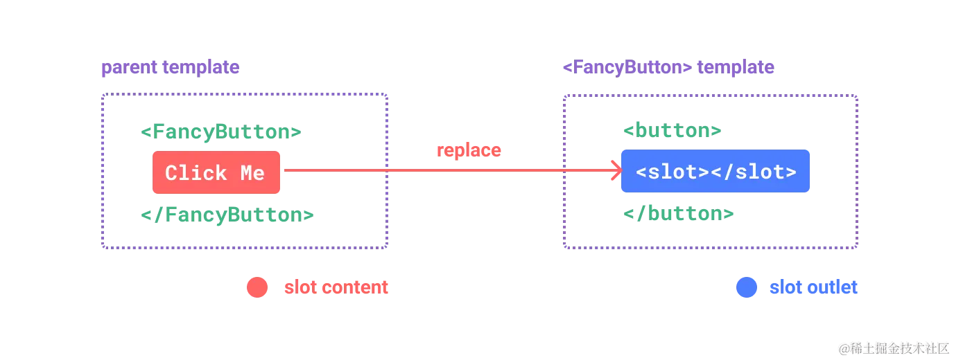其中的<slot>标签标示了父元素提供的插槽内容 (slot content) 将在哪里被渲染。