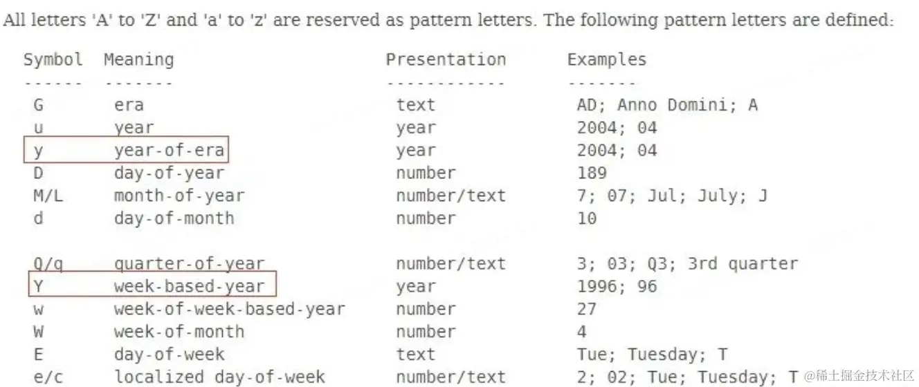 • 【Y:week-based-year】表示当天周所属的年份,一周从周日开始,周六结束,只要本周跨年,那么这周就算入下一年;