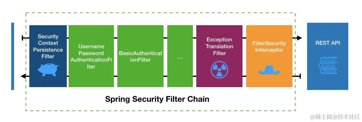 如上图,一个请求想要访问到 API 就会以从左到右的形式经过蓝线框框里面的过滤器,其中绿色部分是负责认证的过滤器,蓝色部分负责异常处理,橙色部分则是负责授权。