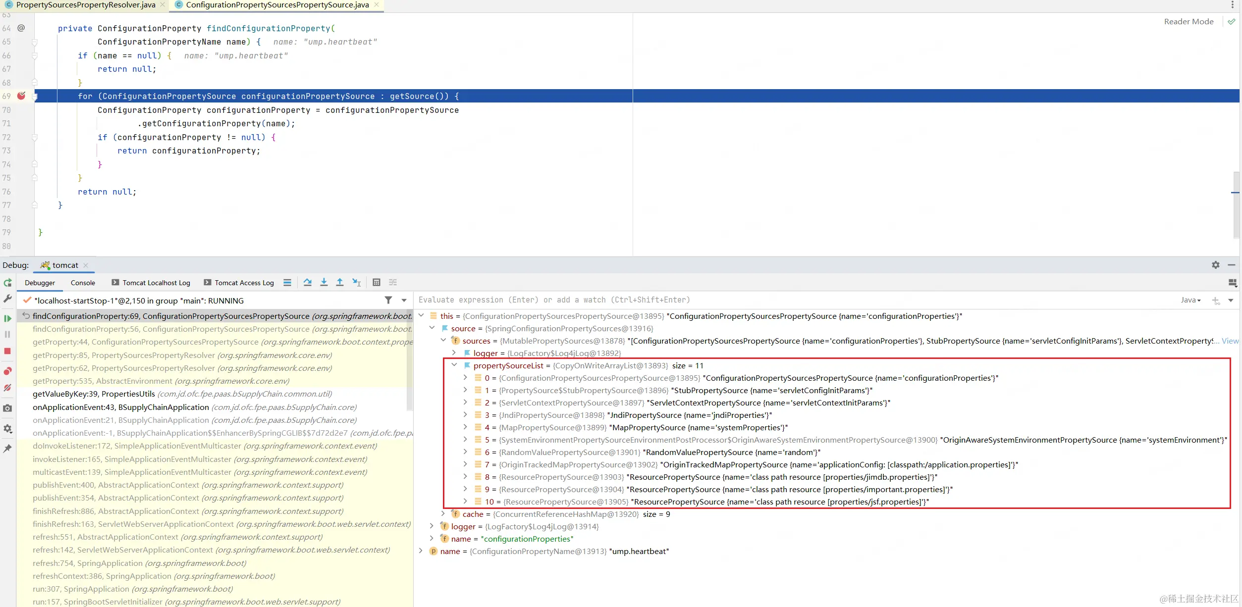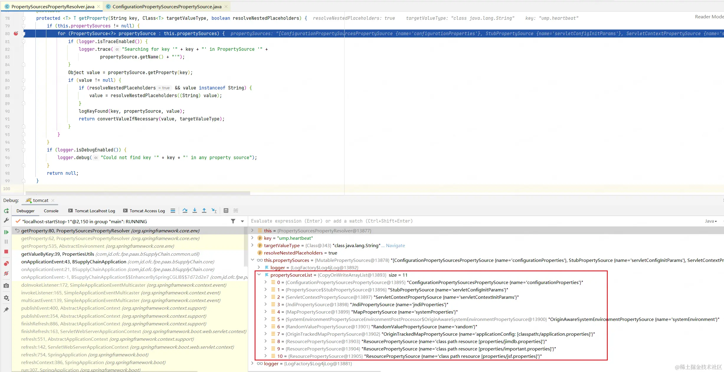 依次循环去获取,取到则返回。这里可以看出在PropertySourceList中JndiPropertySource比OriginTrackedMapPropertySource(application.properties)靠前,由于是顺序读取,所以会先从JndiPropertySource中取值,取不到后才会从OriginTrackedMapPropertySource取值。