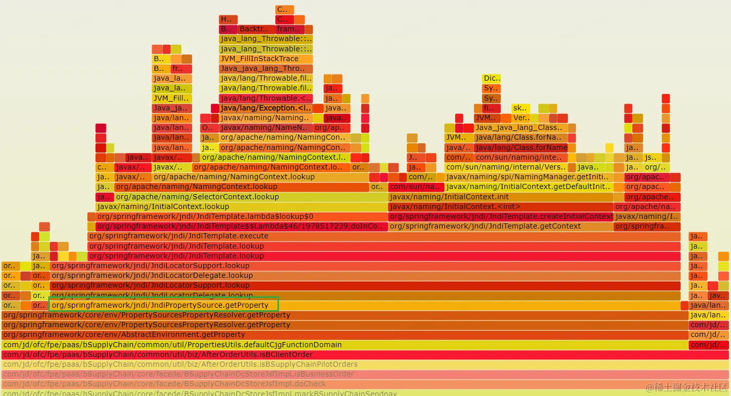 某应用在压测过程机器cpu使用率超过80%,通过在线诊断工具进行CPU采样生成的火焰图,看到程序中频繁调用environment.getProperty()获取属性值,而其内部调用了JndiPropertySource.getProperty()