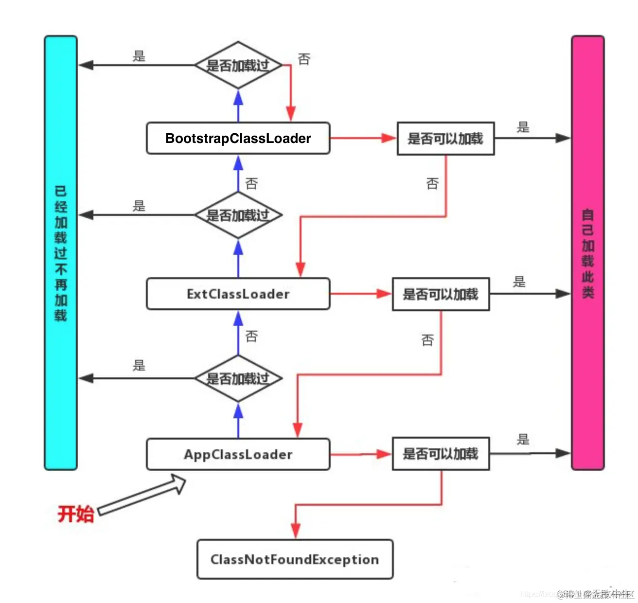 - Bootstrap classLoader:主要负责加载核心的类库(java.lang.*等),构造ExtClassLoader和APPClassLoader。