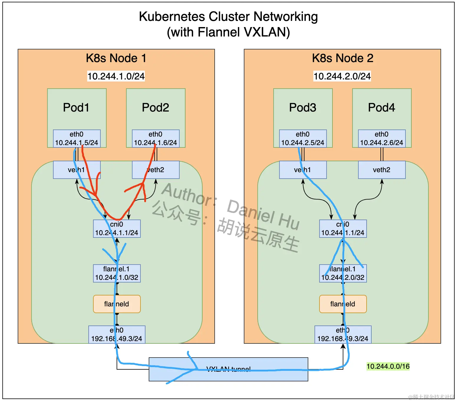 Pod-to-Pod通信(同节点 or 跨节点),以 Flannel VXLAN 模式为例;