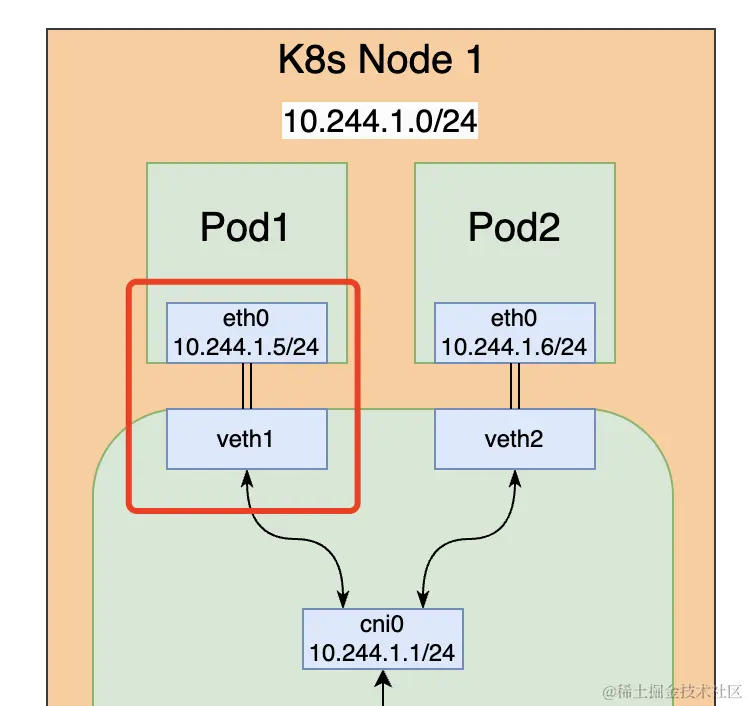 结合起来看,也就是所有发往 10.244.1.0/24 段的数据包都会通过 cni0 传输,10.244.1.0/24 也就是 Flannel 分配给当前节点的 Pod IP 段。