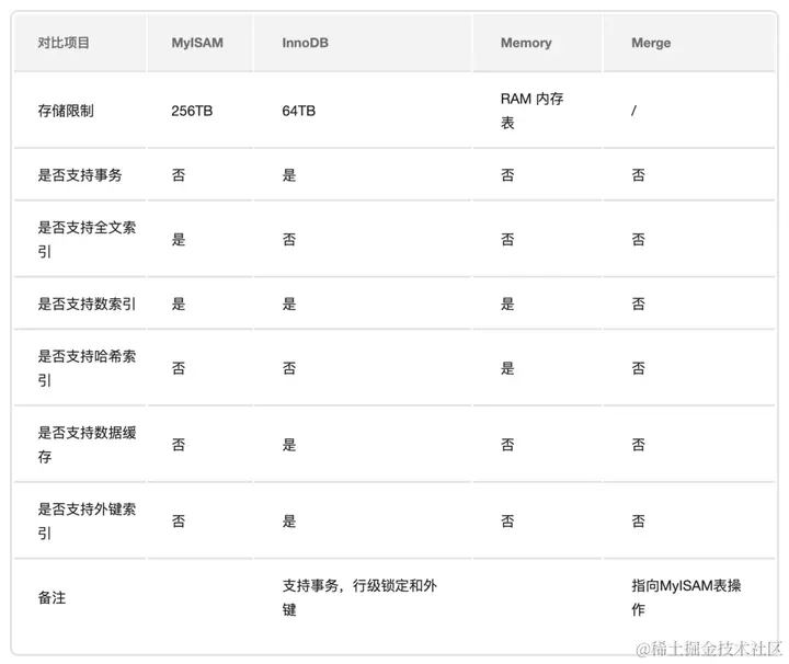 MySQL 存储引擎分类有 MyISAM、InnoDB、Memory、Merge等,可以看上面表中列出的支持引擎,但是其中最为常用的就是 MyISAM 和 InnoDB 两个引擎,其中针对于以上讲到的存储引擎,如下表进行对比: