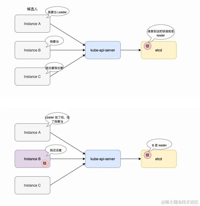 如上图所示,在 k8s 中选主是通过争抢一个分布式锁(Lease)来实现的,抢到锁的实例成为 leader,为了确认自己持续存活,leader 需要不断的续签这个锁(Lease),一旦 leader 挂掉,则锁被释放,其他候选人便可以竞争成为新的 leader。