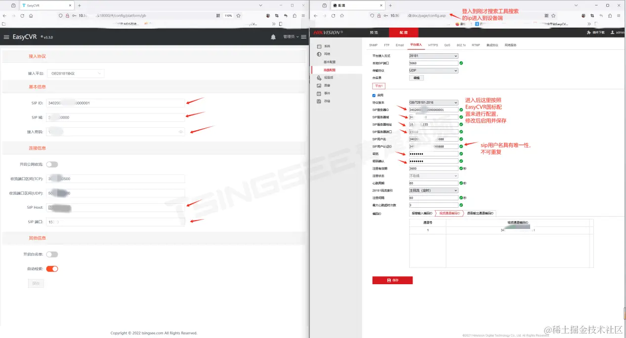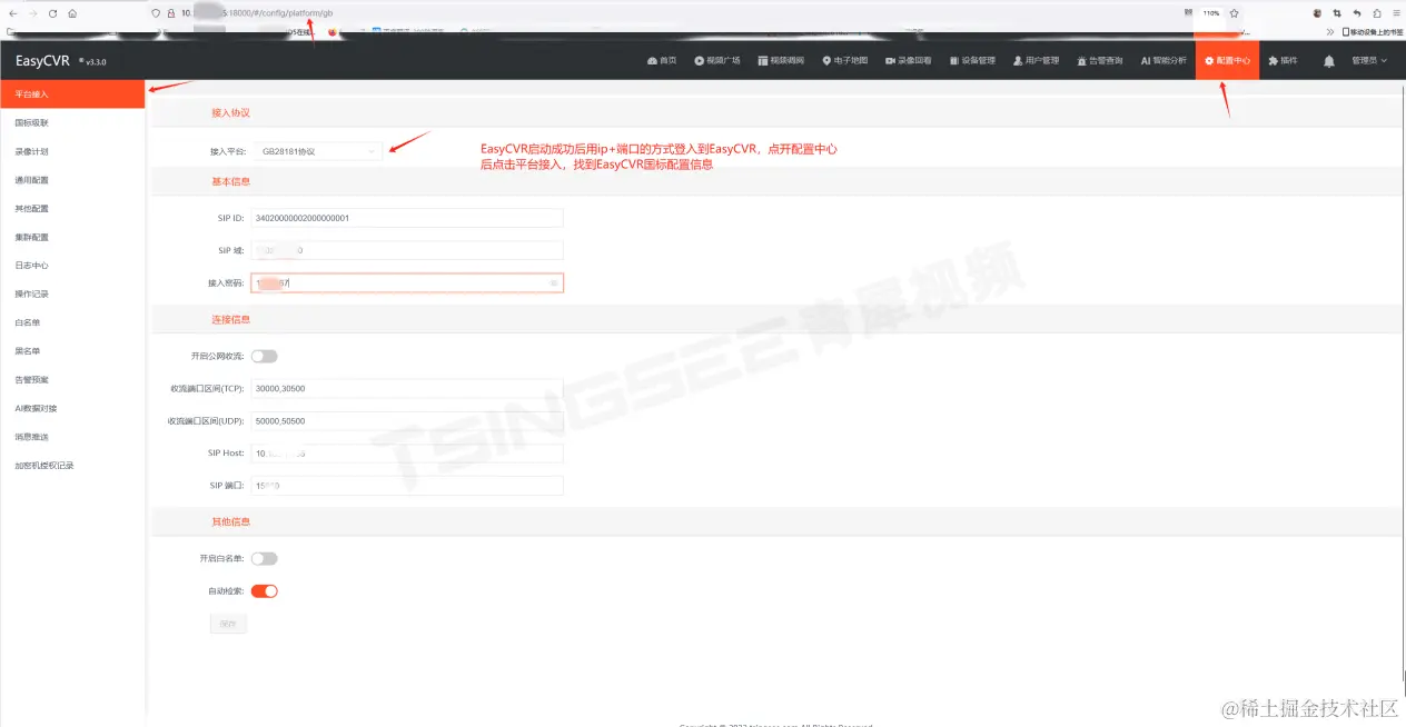 5、启用成功后用ip+端口的访问进行访问EasyCVR,并根据下图标注,使用国标配置信息在设备端进行国标连接配置即可。