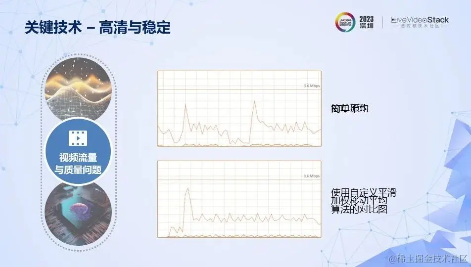 而稳定性方面有一个较大的问题是网络流量容易发生波动,这尤其体现在我们的云电脑场景,流量不稳定容易导致拥塞控制算法误判,进而引发网络中断。针对稳定性问题,我们设计了一套名为加权移动平均的流量平滑算法,上图展示了该算法使用前后的流量波动对比。
