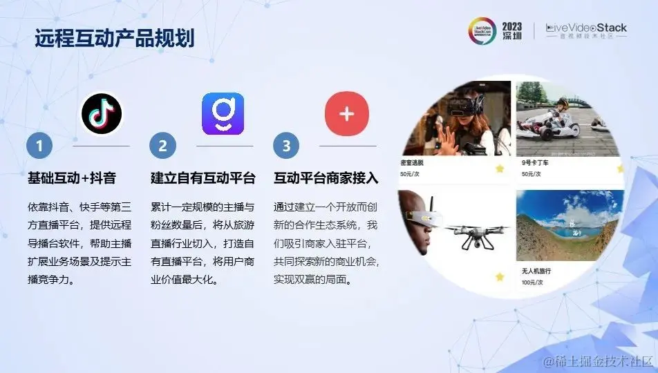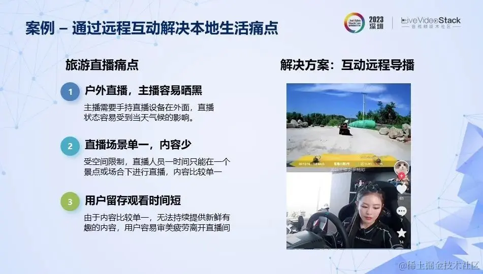接下来介绍一个具体的远程互动应用案例。抖音认识到本地生活服务和旅游行业的商业前景,推出了营销旅游线路和景点门票的主题直播间,虽然成交量不低但仍存在几点瓶颈。