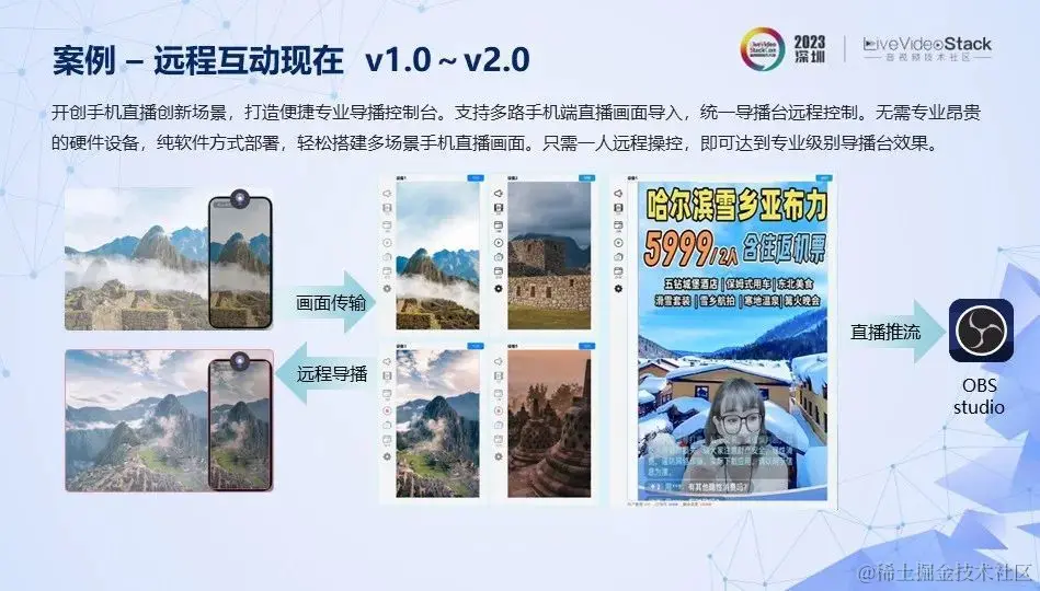 对于以上场景,我们也结合自身考虑推出了一项远程互动导播产品,它把用户的手机打造为远程导播台,可将其他户外设备拍摄的多路画面汇集到用户手机,用户可以依据自身安排将收集到的画面作为直播间背景进行播放。这丰富了直播内容,有效增加了用户粘性。