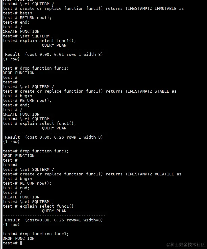 将它分别标记为IMMUTABLE、STABLE、VOLATILE并执行: