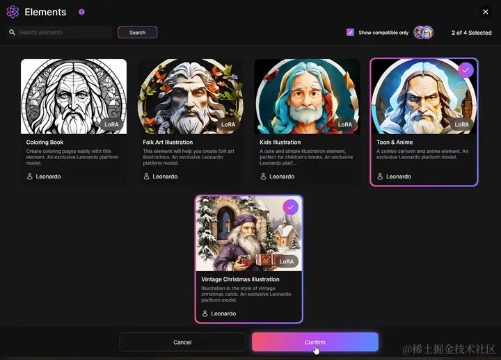 单击添加元素的下拉菜单以选择特定元素,例如着色书、民间艺术插图、儿童插图、卡通和动漫或复古圣诞节插图。您可以选择多个元素,但是,Leonardo警告说,选择两个以上元素可能会产生意想不到的结果。