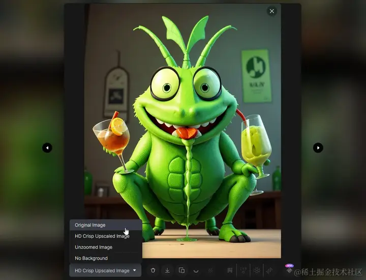 单击“取消缩放图像”按钮可缩小图像,单击“删除背景”按钮可消除整个背景,单击“Alchemy Smooth Upscale”或“Alchemy Crisp Upscale”可提高图像的分辨率。然后,您可以在经过更改的图像和原始版本之间切换。