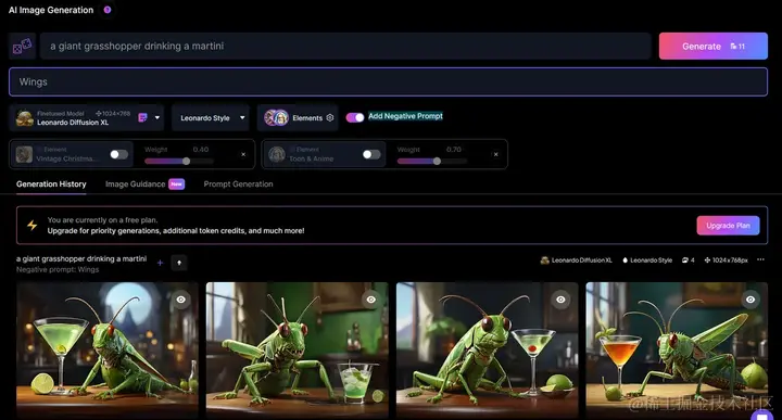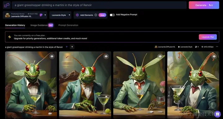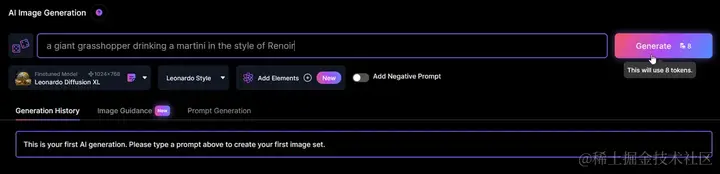 要立即深入了解,请在顶部的提示中输入所需图像的描述。除了输入描述之外,您还可以指定艺术作品的风格。例如,您可以写下您想要一张雷诺阿风格的巨型蚱蜢喝martini的图像。单击生成按钮。将鼠标悬停在该按钮上会告诉您,如果您使用的是免费版本,此提示将消耗多少令牌。