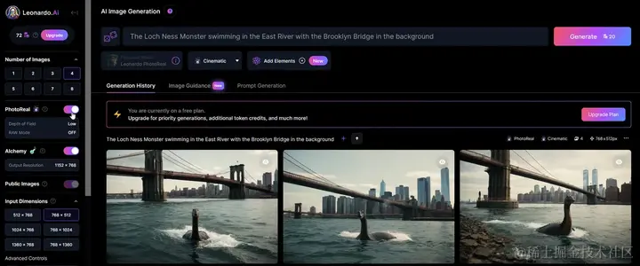 打开 PhotoReal 开关即可生成逼真的图像。然后,您可以将景深设置为高、中或低,并启用 RAW 模式以创建更详细、更大的图像。