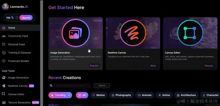 在 Leonardo 的主屏幕上,单击左侧窗格中的“图像生成”条目、中间的图标或右上角的“创建新图像”按钮。