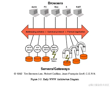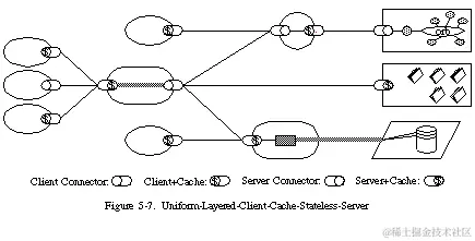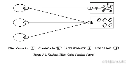 早期的Web架构,如图5-5所示,是由客户端-缓存-无状态-服务器约束集定义的。也就是说,在1994年之前,Web体系结构的设计原理主要集中在通过Internet交换静态文档的无状态客户机-服务器交互上。用于通信交互的协议对非共享缓存有基本的支持,但没有将接口约束为所有资源的一致语义集。相反,Web依赖于使用公共客户端-服务器实现库(CERN libwww)来维护Web应用程序的一致性