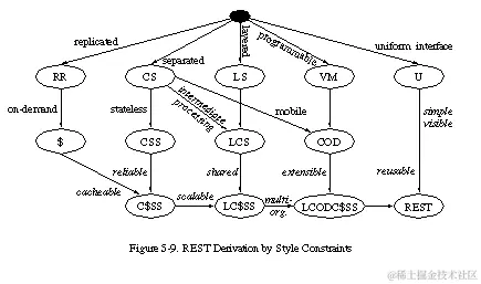 REST由一组架构约束组成,这些约束是根据它们在候选架构上引入的属性而选择的。虽然这些约束中的每一个都可以单独考虑,但是根据它们从常见架构风格的派生来描述它们,可以更容易地理解它们选择背后的基本原理。图5-9以图形的方式描述了REST约束的推导过程,这些约束是根据第3章中所讨论的基于网络的架构风格来确定的
